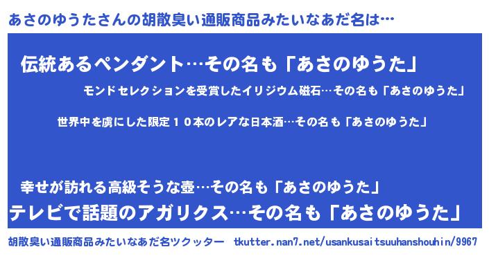 | 意味不明あだ名 | 『住所不定無職あさのゆうた(62歳)』 |