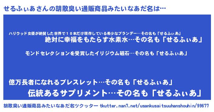 | ヒーロー風カッコイイあだ名 | 『慈愛の使者せるふぃあ』『仮面セルダー』 |