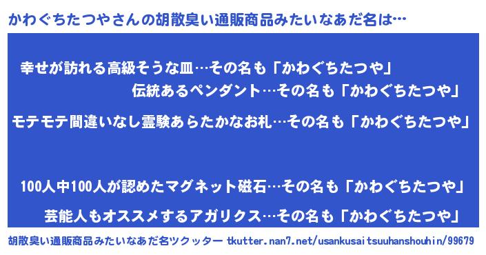 | 肩書あだ名 | 『かわぐちたつや御曹司』 |