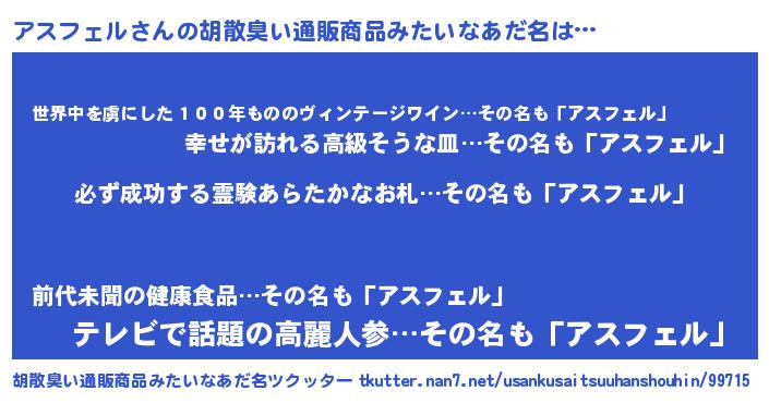| 男性向けラノベタイトル風あだ名 | 『アスフェルの憂鬱』 |
