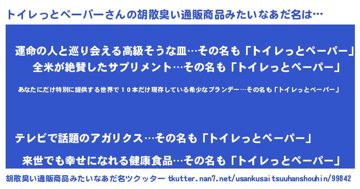 | 意味不明あだ名 | 『住所不定無職トイレっとペーパー(81歳)』 |