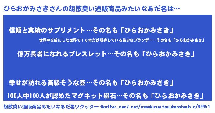 | 恥ずかしいあだ名 | 『プリティーひらおかみさき』『ひらちん』 |
