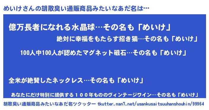 | ヘコむあだ名 | 『めいにー』『めいけ(爆)』『めいを』 |