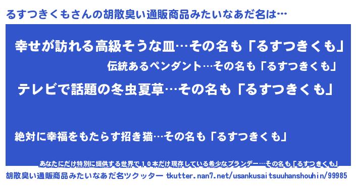 | 意味不明あだ名 | 『自称るすつきくも』 |