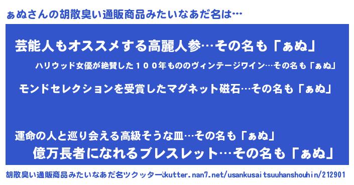 | 男性向けラノベタイトル風あだ名 | 『ノーゲーム・ノーァヌ』『ぁぬの憂鬱』 |