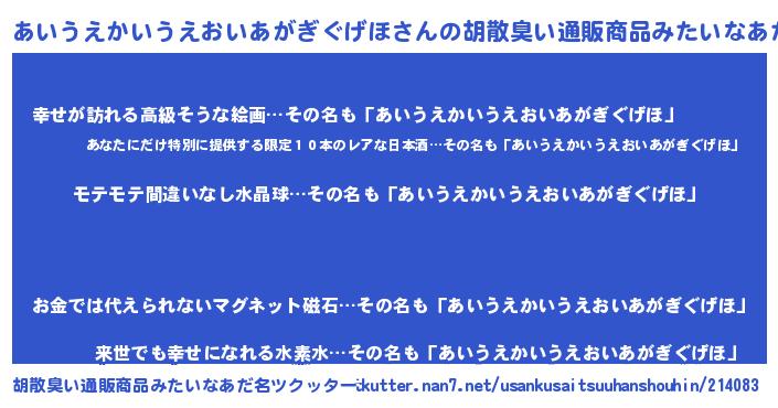 | 男性向けラノベタイトル風あだ名 | 『冴えないあいうえかいうえおいあがぎぐげほの育てかた』 |