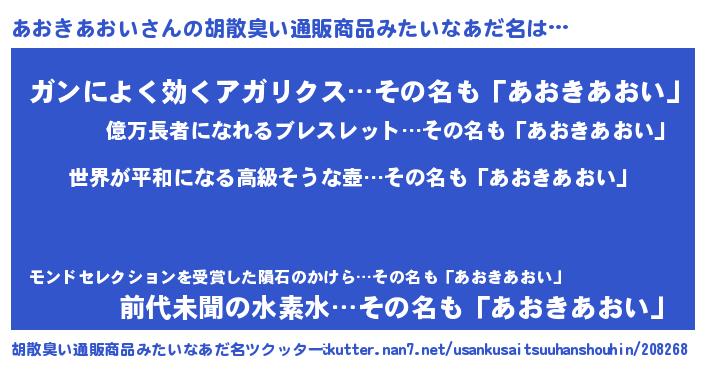 | 男性向けラノベタイトル風あだ名 | 『あおきあおいに滅ぼされるだけの簡単なお仕事です』 |