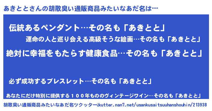 | ヘコむあだ名 | 『あきとと(爆)』『あきっちょ』 |