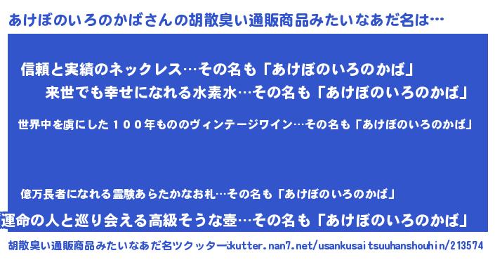 | 意味不明あだ名 | 『住所不定無職あけぼのいろのかば(9歳)』 |