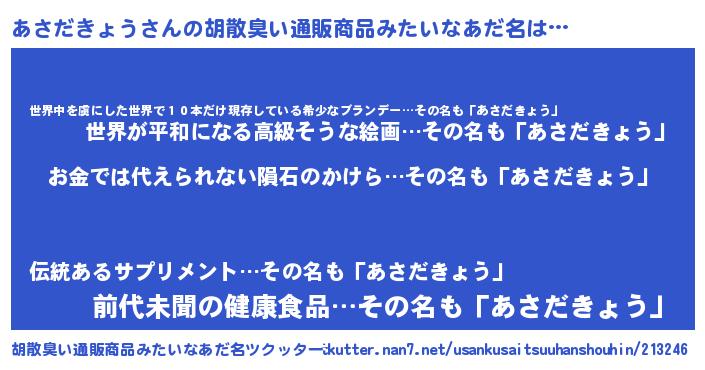 | 男性向けラノベタイトル風あだ名 | 『ノーゲーム・ノーアサダキョウ』 |