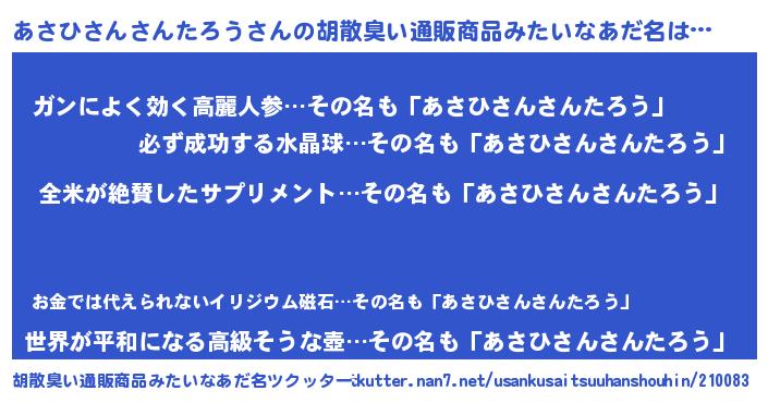 | 男性向けラノベタイトル風あだ名 | 『あさひさんさんたろうの嫁は女の子じゃないと思った?』 |