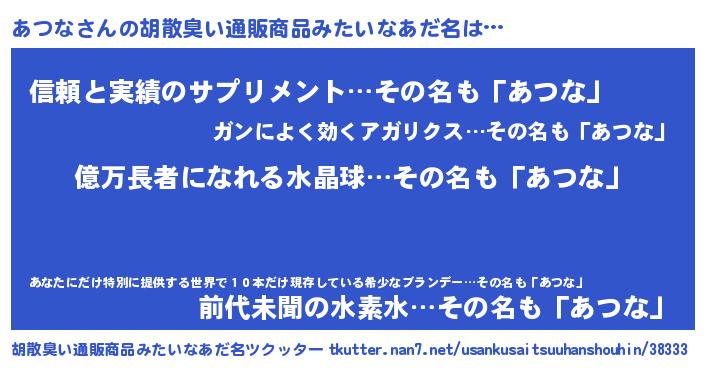 | ヘコむあだ名 | 『あつにゅー』『あつ太郎』『つくし』 |