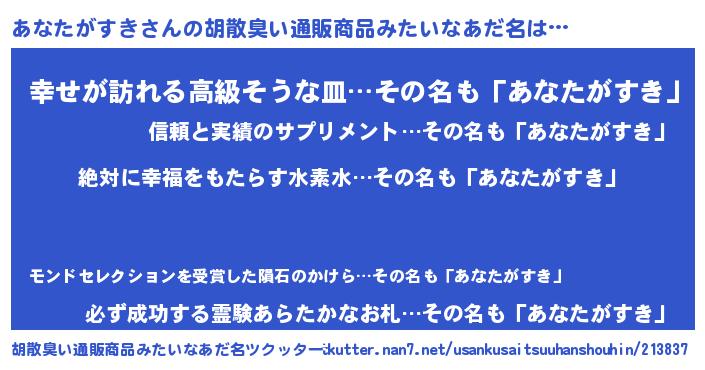 | 男性向けラノベタイトル風あだ名 | 『アナタガスキスレイヤー』 |