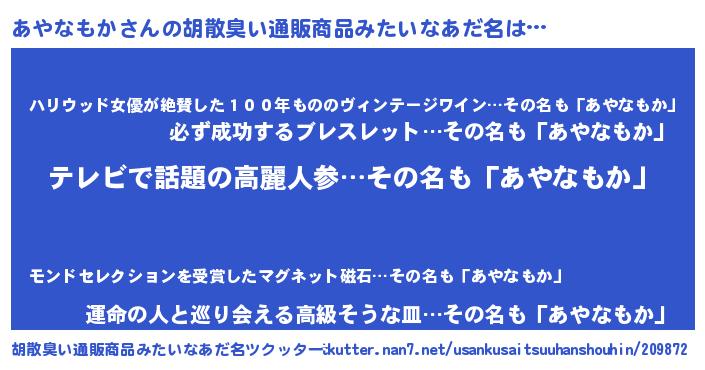 | 意味不明あだ名 | 『自称あやなもか』『ペロリンあやなもか』 |