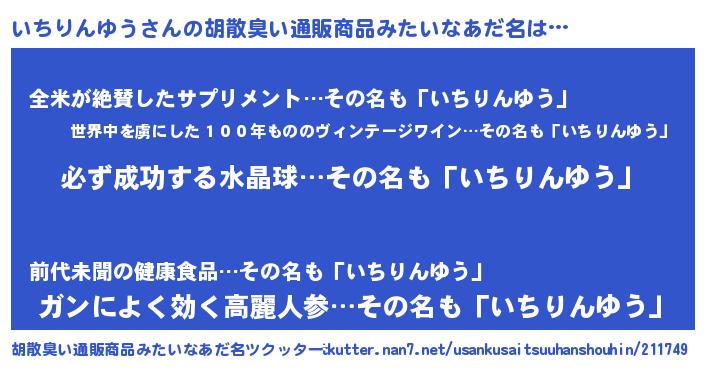 | 男性向けラノベタイトル風あだ名 | 『イチリンユウスレイヤー』 |