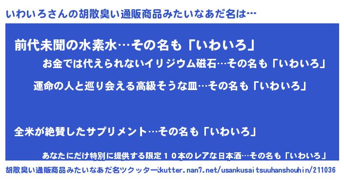| 男性向けラノベタイトル風あだ名 | 『うちのいわいろが世界を掌握している!』 |