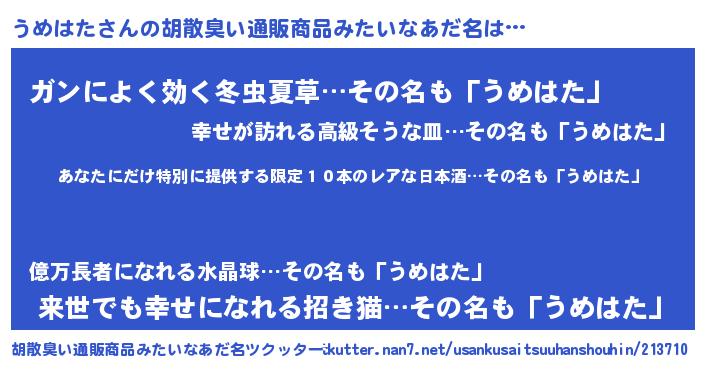 | 意味不明あだ名 | 『住所不定無職うめはた(40歳)』 |
