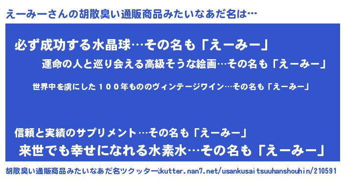 | 男性向けラノベタイトル風あだ名 | 『転生したらえーみーだった件』 |