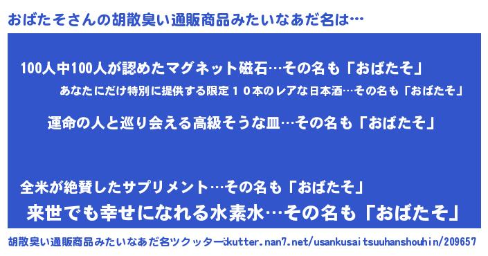 | 男性向けラノベタイトル風あだ名 | 『おばたそに滅ぼされるだけの簡単なお仕事です』 |