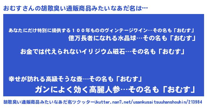 | 意味不明あだ名 | 『なめこ科おむす属』『自称おむす』 |