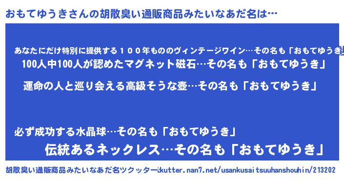 | 男性向けラノベタイトル風あだ名 | 『おもてゆうき~年齢イコール彼女いない歴の魔法使い~』 |