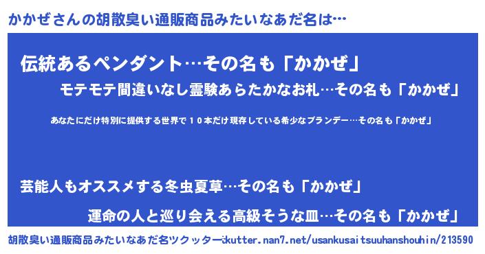 | 男性向けラノベタイトル風あだ名 | 『かかぜ~年齢イコール彼女いない歴の魔法使い~』 |
