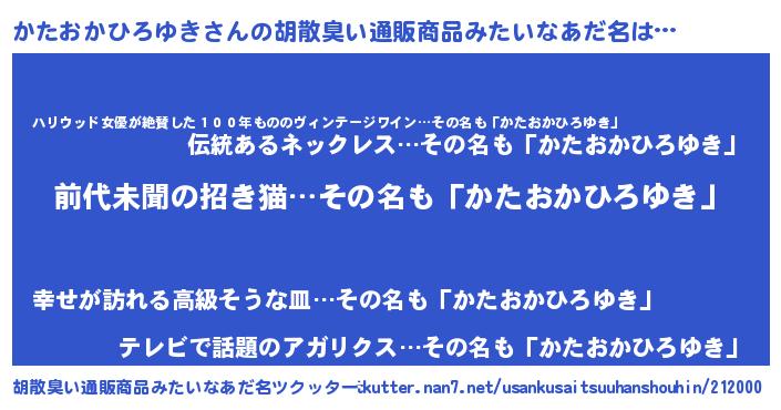 | 男性向けラノベタイトル風あだ名 | 『かたおかひろゆきに滅ぼされるだけの簡単なお仕事です』 |