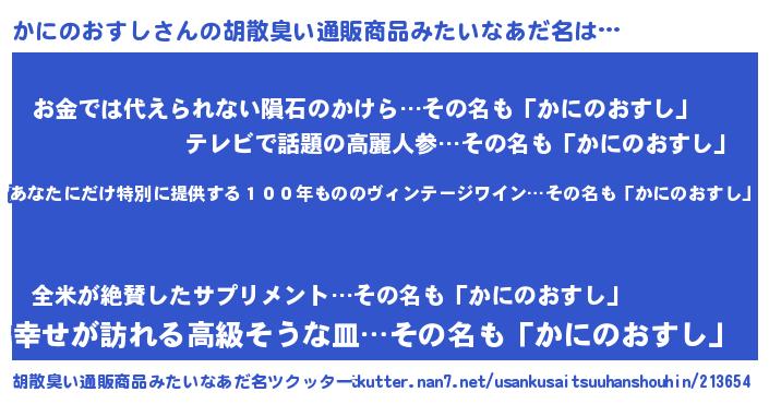 | 欧米人風あだ名 | 『アンジェラ・かにのおすし』 |