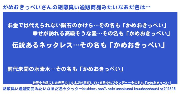 | 男性向けラノベタイトル風あだ名 | 『かめおきっぺいの嫁は女の子じゃないと思った?』 |