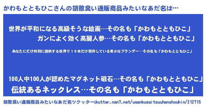 | 男性向けラノベタイトル風あだ名 | 『この素晴らしい世界にかわもとともひこを!』 |