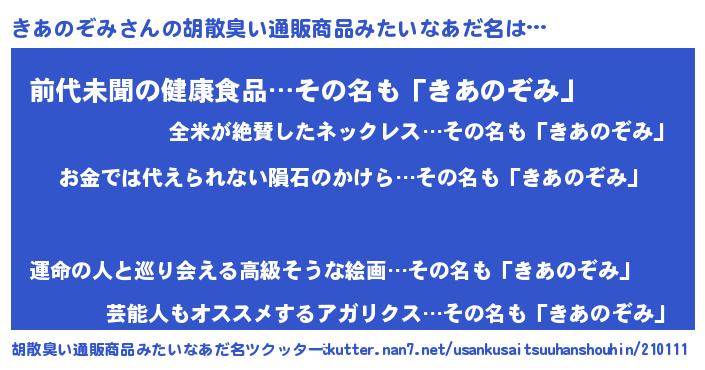 | ヘコむあだ名 | 『きあのぞみ(苦笑)』『きあっぺ』 |
