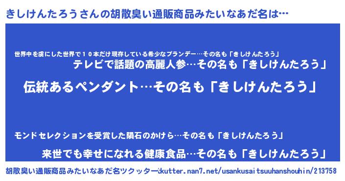 | 男性向けラノベタイトル風あだ名 | 『きしけんたろうの嫁は女の子じゃないと思った?』 |