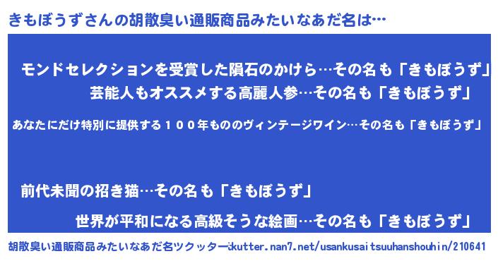 | 男性向けラノベタイトル風あだ名 | 『きもぼうずに滅ぼされるだけの簡単なお仕事です』 |