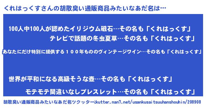 | 男性向けラノベタイトル風あだ名 | 『くれはっくすに滅ぼされるだけの簡単なお仕事です』 |
