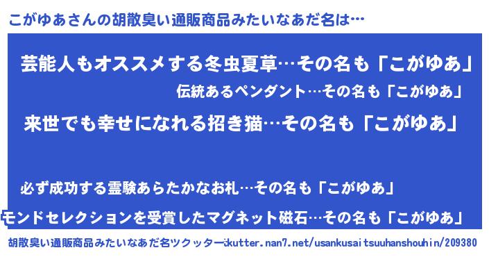 | ヘコむあだ名 | 『こがゆあ(笑)』『こがっぺ』 |