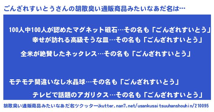 | 女子向けラノベタイトル風あだ名 | 『ごんざれすいとう様がみてる』 |