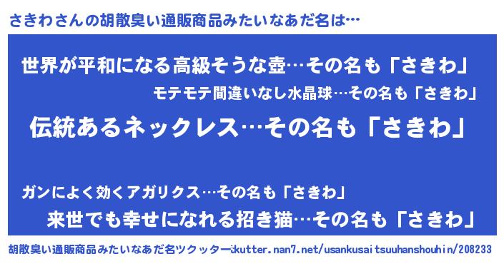 | 意味不明あだ名 | 『なめこ科さきわ属』『永久保存さきわ』 |