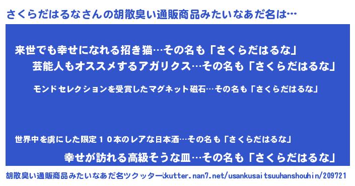 | 男性向けラノベタイトル風あだ名 | 『さくらだはるな~年齢イコール彼女いない歴の魔法使い~』 |