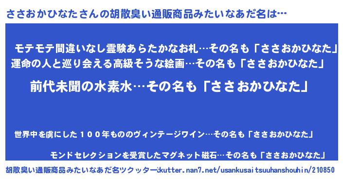 | ヘコむあだ名 | 『ささおかひなた(遠い目)』『ささっふぃ~』 |