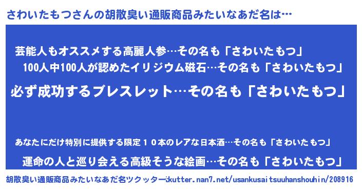 | 男性向けラノベタイトル風あだ名 | 『さわいたもつの憂鬱』 |
