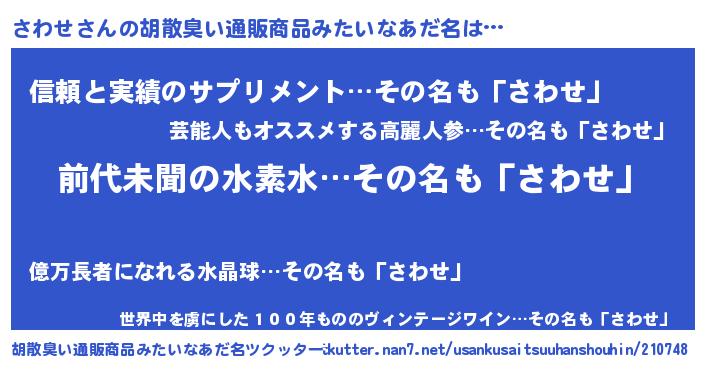 | 男性向けラノベタイトル風あだ名 | 『さわせに滅ぼされるだけの簡単なお仕事です』 |