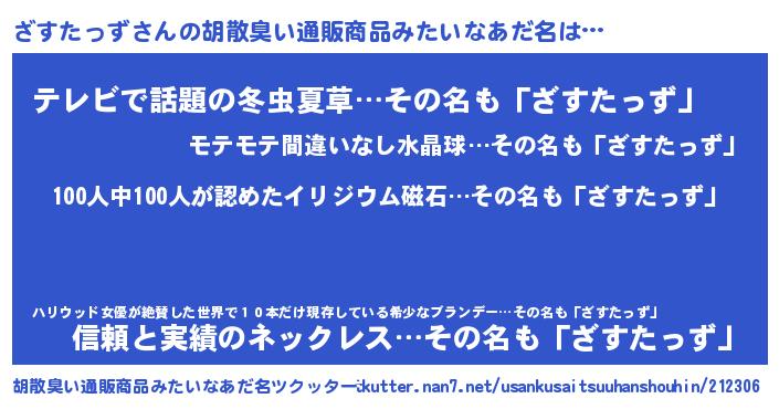 | 男性向けラノベタイトル風あだ名 | 『おまえをオタクにしてやるから、俺をざすたっずにしてくれ! 』 |