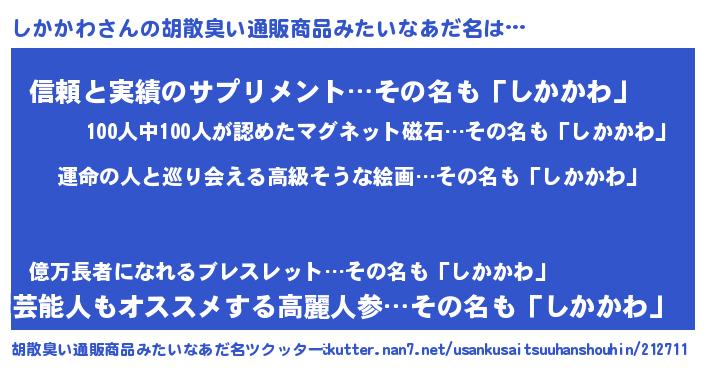 | 意味不明あだ名 | 『しかかわフォーエバー』『自称しかかわ』 |