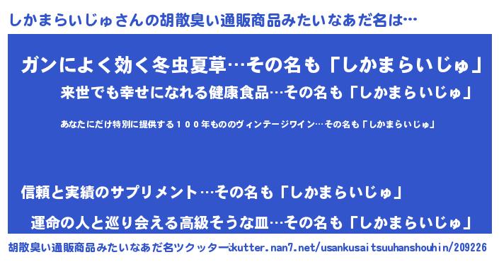 | 意味不明あだ名 | 『住所不定無職しかまらいじゅ(7歳)』 |