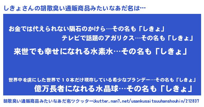 | ヘコむあだ名 | 『しきょ(震え声)』『しきっふぃ~』 |