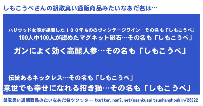 | 意味不明あだ名 | 『自称しもこうべ』『永久保存しもこうべ』 |