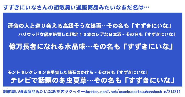 | 男性向けラノベタイトル風あだ名 | 『すずきにいなに滅ぼされるだけの簡単なお仕事です』 |