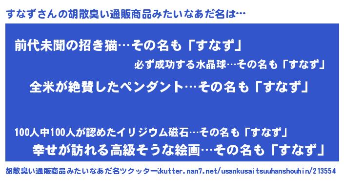 | 男性向けラノベタイトル風あだ名 | 『すなず~年齢イコール彼女いない歴の魔法使い~』 |