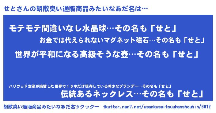 | ヘコむあだ名 | 『なまこ酢』『せともー』『せと太郎』 |