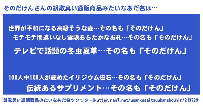 | 男性向けラノベタイトル風あだ名 | 『Re:そのだけんから始める異世界生活』 |